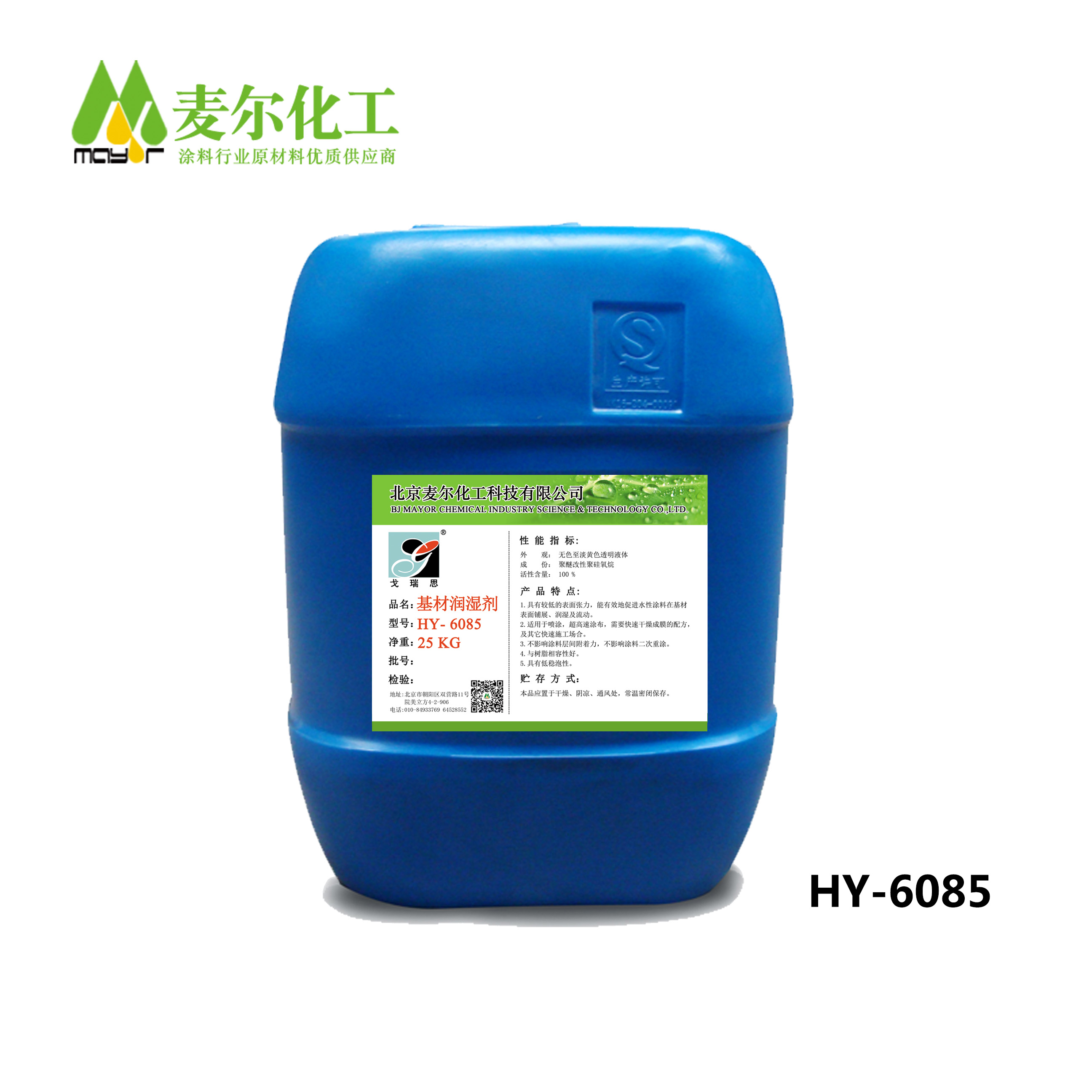 北京麦尔化工自行研发生产的HY-6085基材润湿剂,是一种水性工业漆助剂,该助剂的主要成分是聚醚改性聚硅氧烷,其具有优异的基材润湿性和渗透性,能提高涂料对基材的附着力,有效防止缩孔,且与树脂具有很好的相容性,不影响涂料性能,不增进滑爽、不影响层间附着牢度和重涂性。