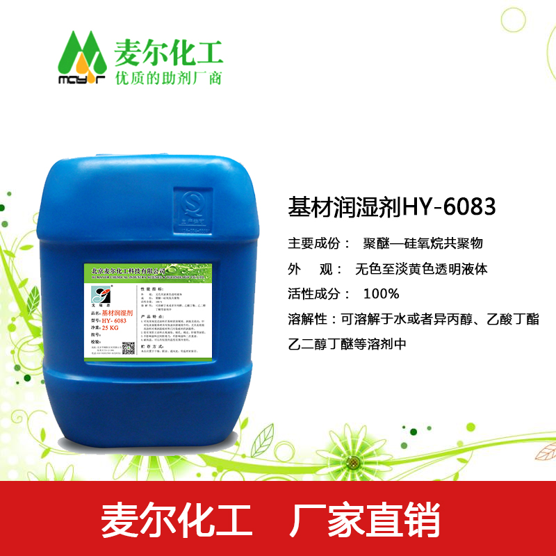 麦尔化工生产的水性工业漆助剂HY-6083基材润湿剂是一种优异的基材润湿剂,主要成分是聚醚-硅氧烷共聚物,该基材润湿剂具有极低的表面张力,能有效提高涂料对难润湿剂底材和已污染底材的润湿性,防止表面缺点,促进涂料的流动、流平,降低涂料体系的浓度和粘性,消除基材缩孔,针眼等弊病,具有优异的树脂相容性。