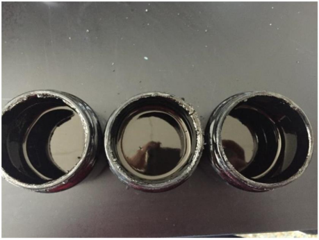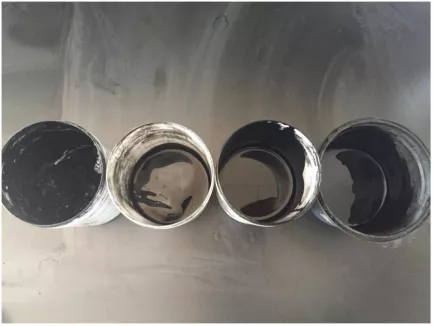 选取三支具有代表性的炭黑,两支国产,一支进口。同样分散40%的炭黑,得到的色浆状态如下,测试细度都小于15微米,表面平整,无小颗粒,流动性很好。
