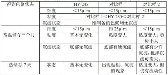 不同分散剂,相同配方得到的色浆性能,通过热储存2小时以及常温储存一个月、两个月、三个月观察粘度、是否有返粗、絮凝等弊病。三支不同的分散剂添加量都是15%,炭黑添加量均为40%,观察的状态如下表:
