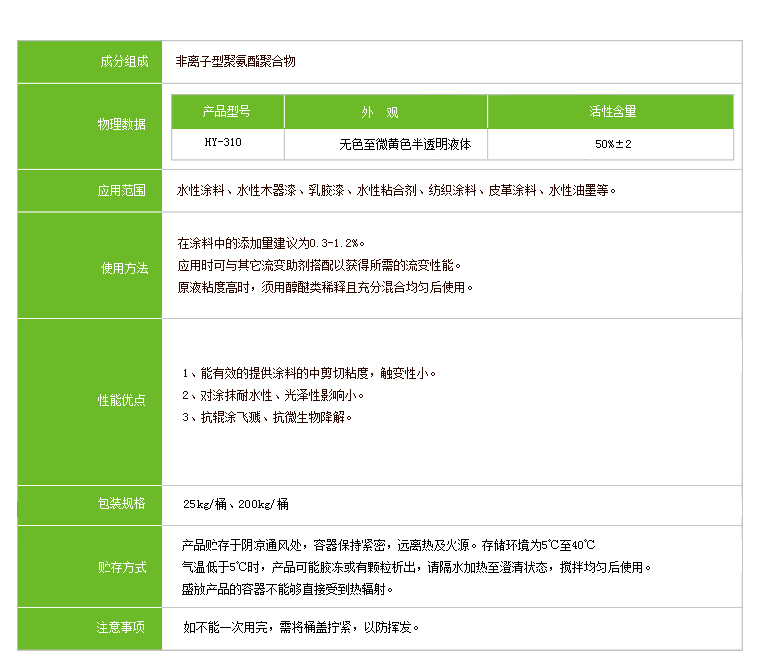 水性工业漆增稠剂HY-310非离子缔合型聚氨酯增稠剂,具有良好的增稠效果和粘度稳定性以及优异的流平性,被广泛应用于水性涂料体系中。
