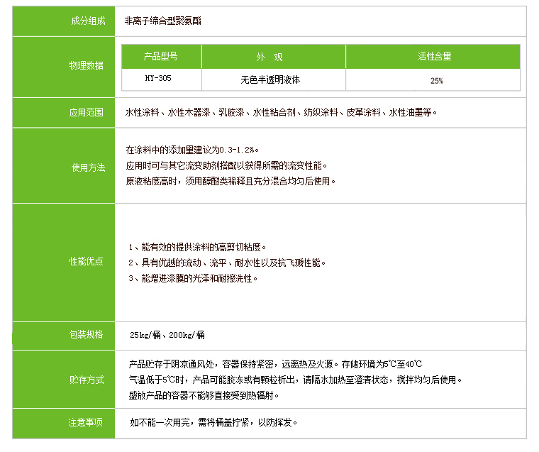 水性工业漆增稠剂HY-305非离子缔合型聚氨酯增稠剂,具有良好的增稠效果和粘度稳定性以及优异的流平性,被广泛应用于水性涂料体系中。