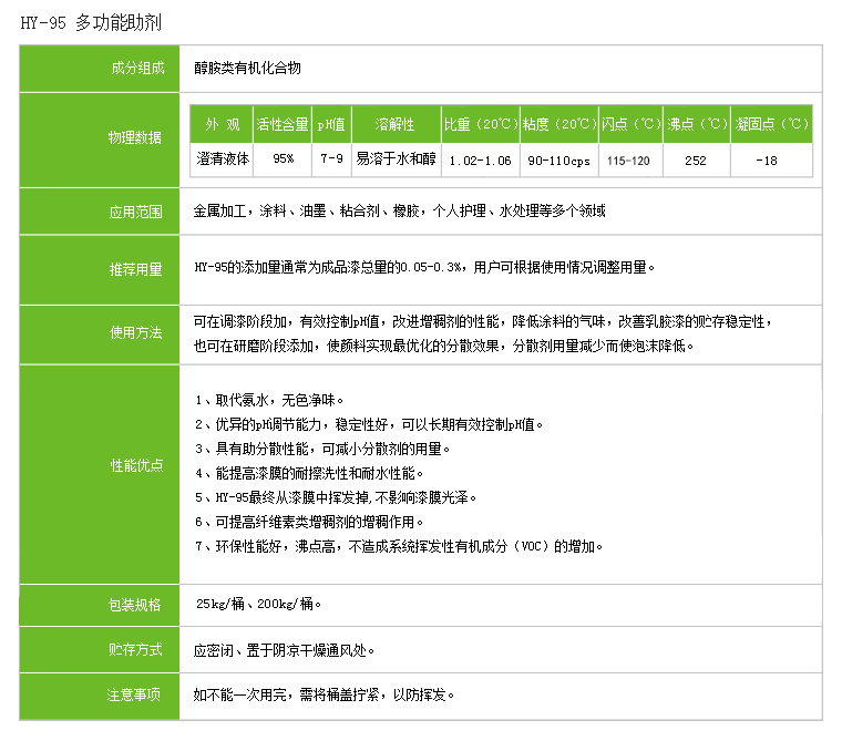 HY-95是一种多功能助剂,适用于乳胶漆。能有效控制乳胶漆的pH值,具有高效助分散作用。HY-95可以大幅度提高涂料的综合性能,降低涂料成本。目前广泛地用于金属加工,涂料、油墨、粘合剂、橡胶,个人护理、水处理等多个领域。