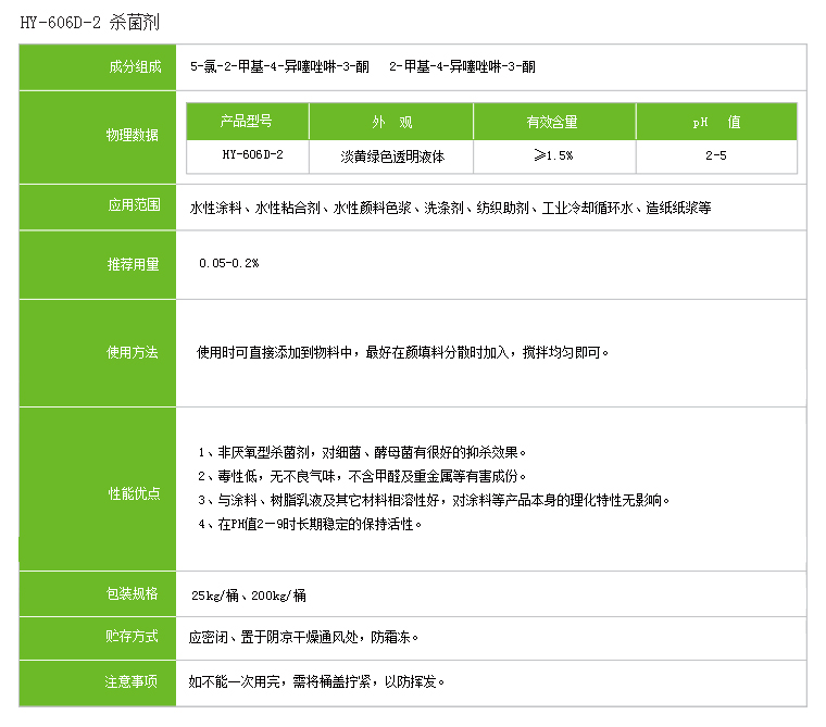 HY-606D-2是一种高效、广谱、环保型罐内防腐杀菌剂,对各种细菌、酵母菌等微生物具有广泛的抑杀效果,适用于各种水性涂料、高分子聚合物乳液、水性粘合剂、水性颜料色浆、洗涤剂、纺织助剂、工业冷却循环水、造纸纸浆等方面的防腐杀菌。